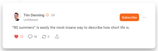 I recently read a Substack note from Tim Denning that said our lives are just “80 summers.”